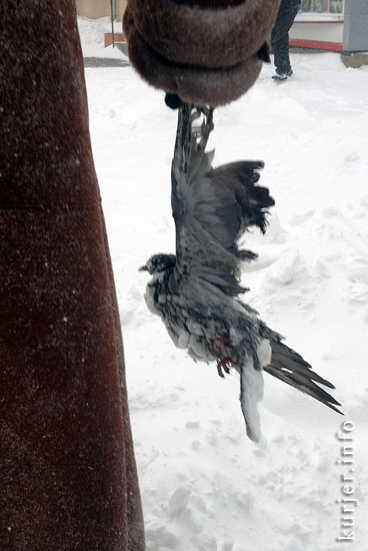 Первая зафиксированная жертва мартовской метелицы — голубь. Какая-то женщина несла его долгое время, пока не зашла почему-то в старый Дом быта, где, среди прочего есть магазин товаров для животных.