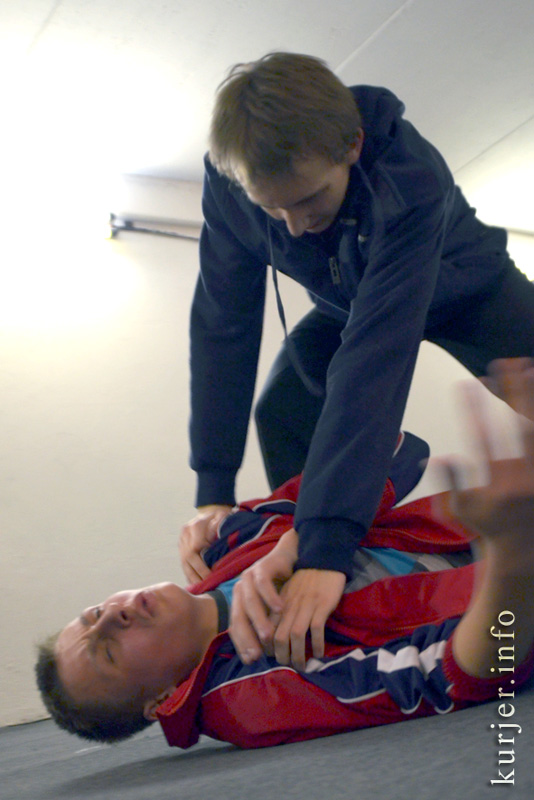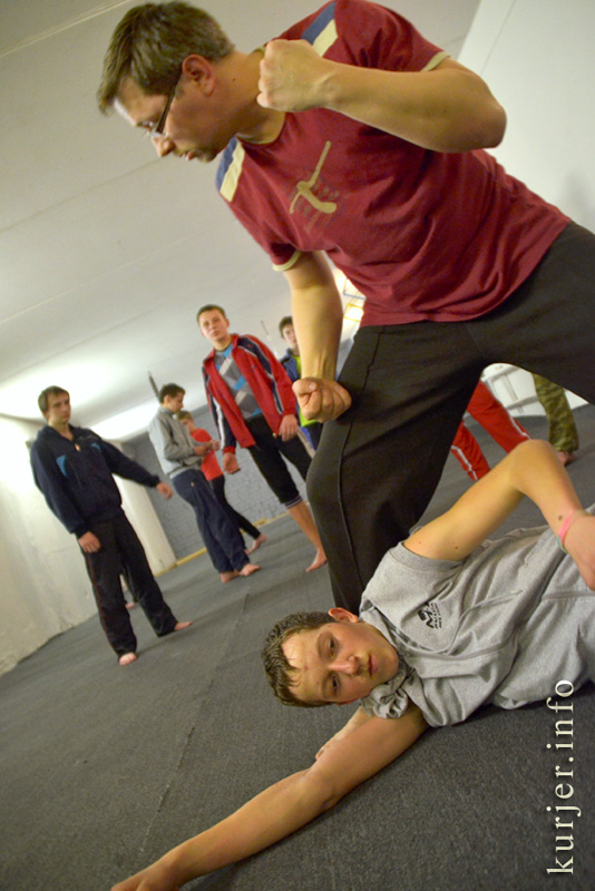 Андрей Латышев объясняет парням принцип применения одного из приёмов самообороны. Фото: Алесь Достанко