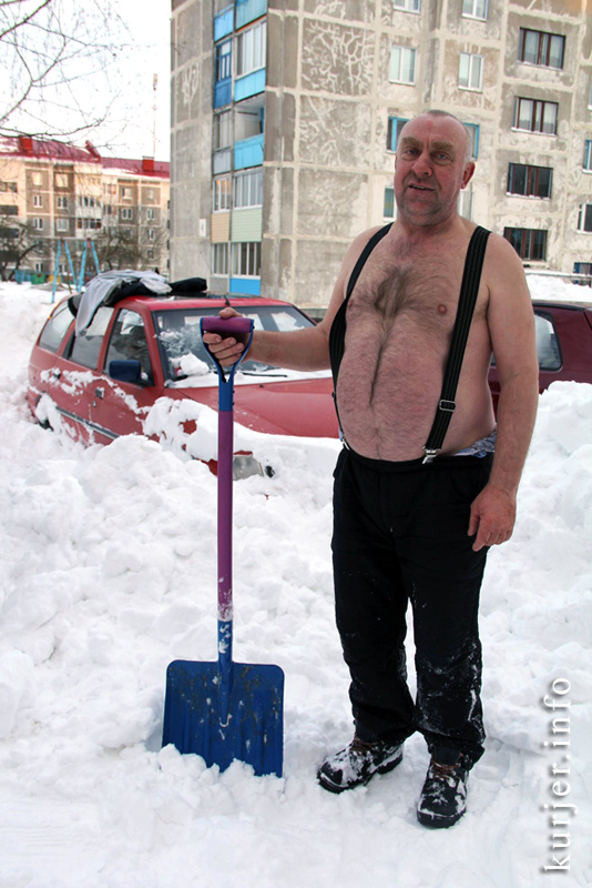 16 марта. Николай Михайлович помогает своему другу расчистить машину от снега. «Я люблю зиму, не люблю жару. Хоть на улице и минусовая температура, чувствую я себя отлично», — сказал он. Фото: Виктория Макарова