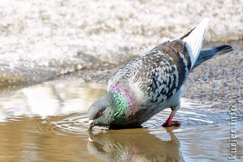 23 марта. Голубь пьёт воду из подтаявшей ненадолго лужи. Фото: Алесь Достанко