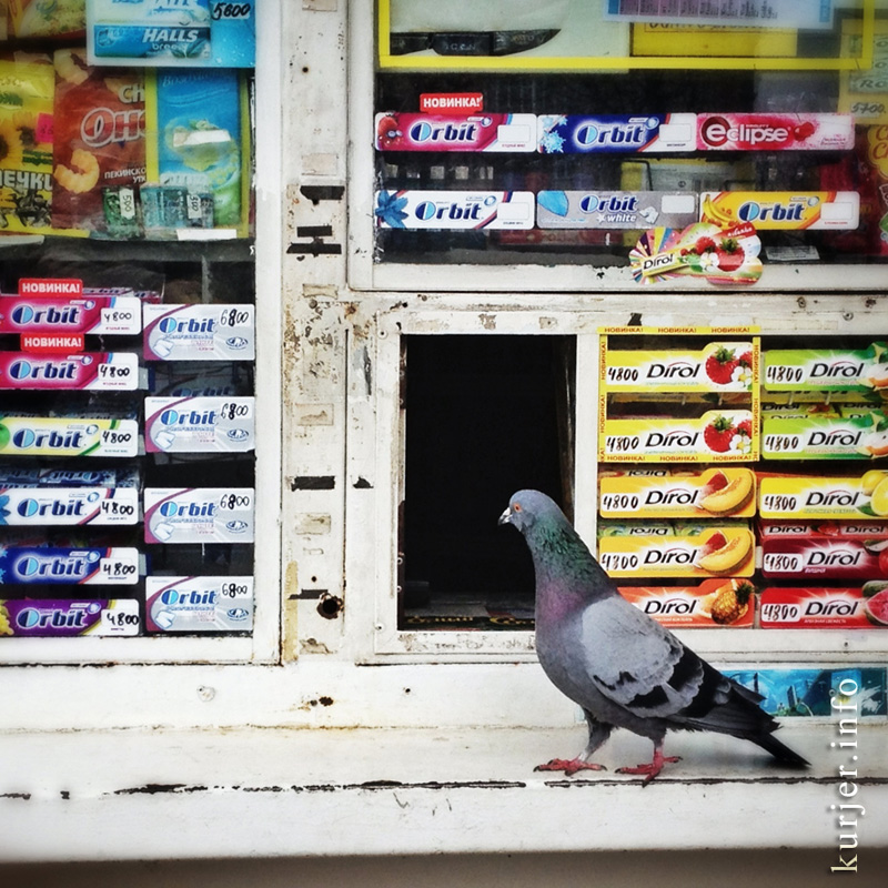 Голубь возле окошка киоска на автобусной остановке «Молодёжный центр».