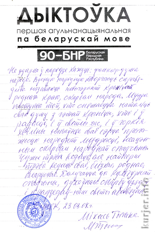 Ліст дыктоўкі, напісанай Міхасём Тычынай 23 сакавіка 2008 года.