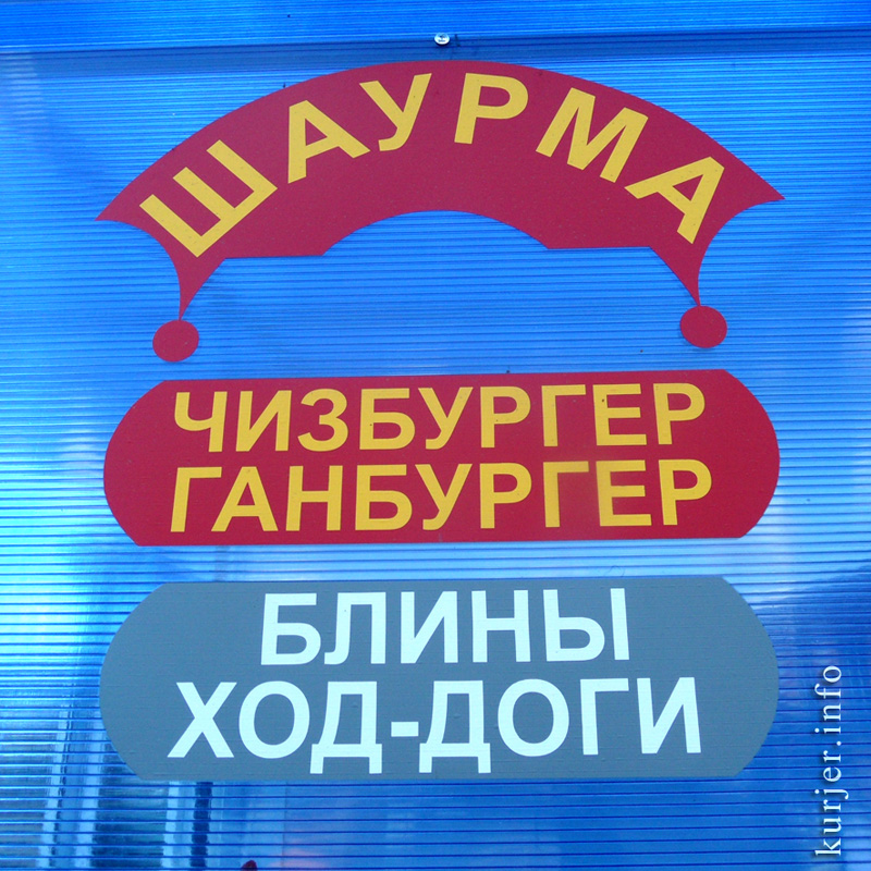 Судя по вывеске, владельцы мини-кафе, расположенного на Слуцком рынке, предлагают горожанам гаНбургер и хоД-дог. Это выглядит новшеством на рынке общепита, где до сих пор предлагали гаМбургеры (hamburger) и хоТ-доги (hot dog).