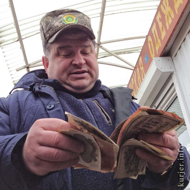 6 апреля. Коллекционер на Слуцком рынке оценивает старинные денежные купюры, которые ему принесла пара случчан. Фото: Алесь Достанко