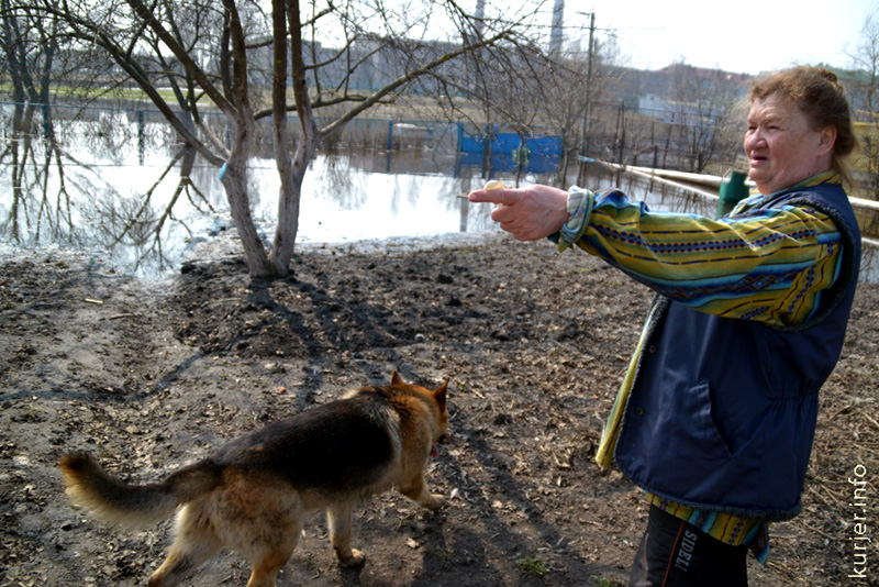 16 апреля. Тамара и Валерий Хотько вынуждены выбираться в город через двор соседей, ведущий на параллельную улицу — Красноармейскую. Их улица вдоль набережной затоплена полностью вышедшей из берегов Случью. Фото: Алесь Достанко