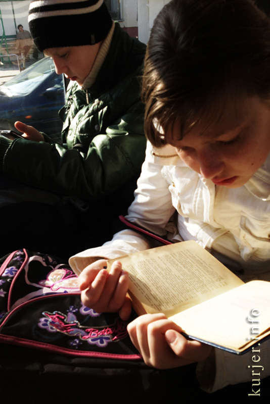 17 апреля. Девочка читает книгу во время поездки в автобусе городского маршрута. Человек с книгой — нынче редкость, как правило случчане заняты просмотром электронных мобильных устройств. Фото: Алесь Достанко