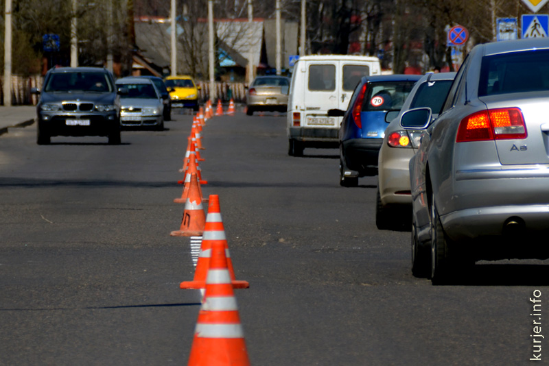23 апреля. Только что обновлённая дорожная разметка на улице 14-ти Партизан обозначена фишками. Фото: Алесь Достанко