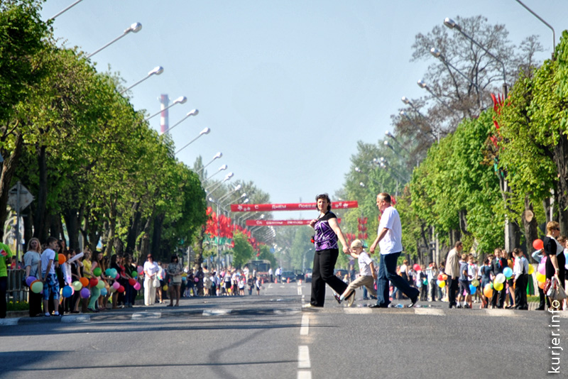 Традиционно на всём протяжении от Молодёжного центра до площади по обеим стороным дороги стояли пионеры, приветствовавшие праздничную колонну.