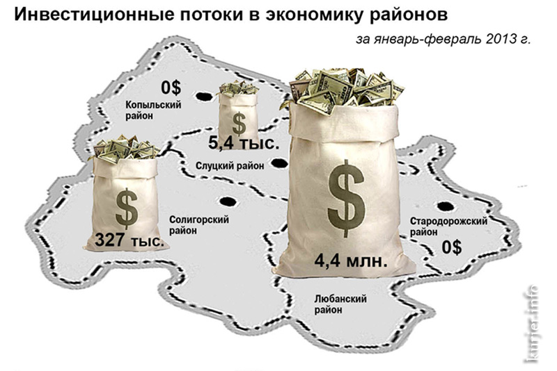 За указанный период иностранные инвесторы вообще не направляли инвестиционных потоков на Копыльщину и Стародорожчину. Капиталовложения в экономику Солигорского района в первые два месяца 2013 года составили 326,8 тысяч долларов.