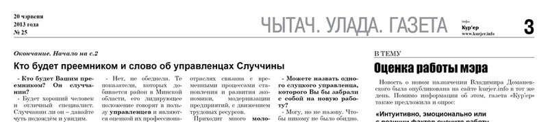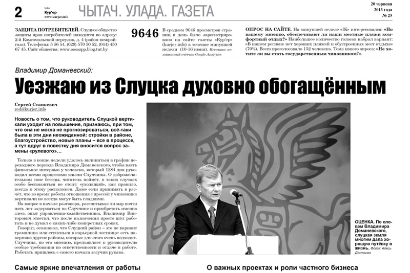В печатном номере газеты «Кур'ер» (покупайте с 20 июня) читайте интервью: "Владимир Доманевский: «Уезжаю из Слуцка духовно обогащённым».