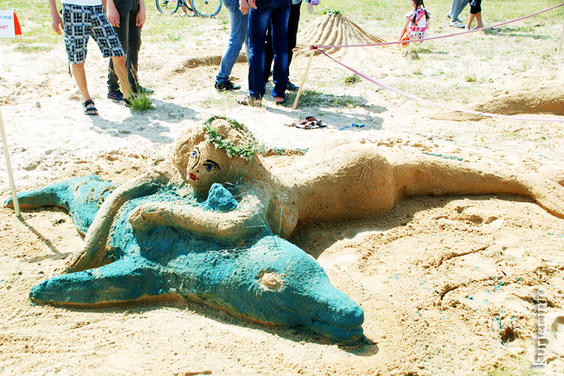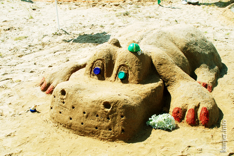 К двум часам дня на площадке детского пляжа выросли фигуры из песка. Как высказался один из членов жюри, в этом году в песчаном монументальном искусстве и архитектуре преобладали морские мотивы. На песке разлеглись бегемоты, драконы, русалки. Только команда Стройтреста №3 осталась верной своей традиции: композиция молодых строителей называлась «Из рога – всего много» и представляла собой город из песка.