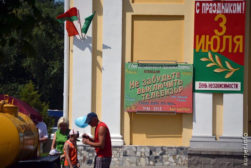 Праздничные надписи сообщали о разном: «3 июля», «3 ліпеня», «С праздником 3 июля», «3 июля День освобождения Беларуси», «Са святам 3 ліпеня», «3 июля День Республики». Встречалась и надпись «С Днём Независимости».