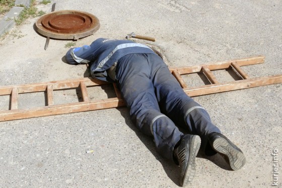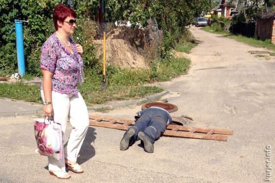 А вот ещё один фрагмент из рабочих будней у канализационного колодца — связист на улице 8 Марта. Снимки сделаны вчера, 18 июля: