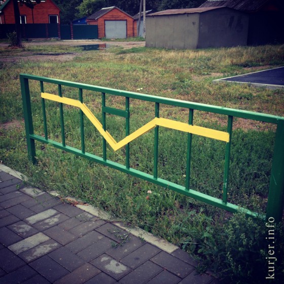 В некоторых дворах Слуцка устанавливают новые ограждения с жёлтыми элементами на них. Некоторым случчанам они напоминают значок метро. Фото: Алесь Достанко