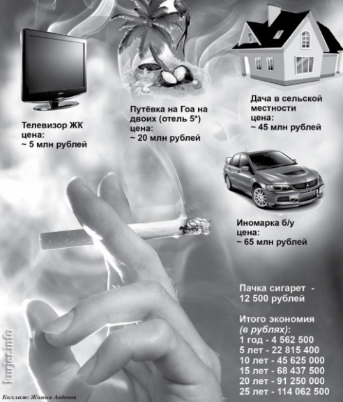 Хотите узнать больше? Отдых на Гоа, телевизор, дача, машина – «Кур’ер» посчитал, что можно купить, если отказаться от вредной привычки дымить сигаретой. С начала ...