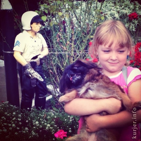 Хотите узнать больше? Девочка, пёс и полицейский. На мосту возле Слуцкой гимназии №1. У одного малыша кепка с Молнией МакКуин, у другого — с Кунг-фу Пандой. Вид ...