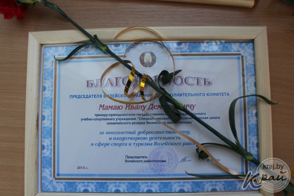 В этот день прозвучали поздравления от представителей Вилейского райисполкома. В торжественной обстановке ветеранам спорта вручили благодарности от председателя: заслуженному тренеру БССР Николаю Баеву, посвятившему развитию спорта 50 лет, Петру Зайцеву, подготовившему мастеров спорта международного класса по прыжкам на батуте, тренеру-преподавателю Ивану Мамаю, вырастившему победителей и призеров различных первенств и чемпионатов.
