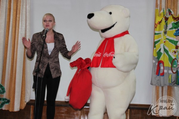 Традиционно гости приехали в школу-интернат с подарками. Воспитанникам подарили спортивный инвентарь: клюшки, шапочки для плавания, мячи. А белый медведь, ростовая кукла «Coca-Cola», раздавал ребятам мягкие игрушки и фликеры.