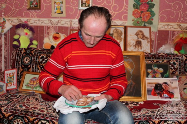 – Я вырос среди рукодельниц! Мама и бабушка ткали, вышивали и вязали, даже под заказ. Я смог бы легко связать свитер. Но вышивку люблю больше, – говорит он, демонстрируя пяльцы с еще незаконченной работой. – Сначала я трудился в колхозе, работа была нервная, вот и решил взять в руки пяльцы, чтобы успокоиться. А сейчас вышиваю для себя, и для гостей всегда есть подарок. Сколько работ всего? Не знаю. За сотню уже перевалило, почти все я раздарил друзьям и родственникам. Вот эту икону, – показывает на образ Иисуса Христа, – я вышивал месяц. Некоторые картины могу сделать за три вечера. Все зависит от сложности рисунка. Но летом шить некогда – это занятие для зимних вечеров. Много животных на картинах из-за того, что жена любит котов, вот и стараюсь вышивать, чтобы ее порадовать. Но есть у меня мечта, – говорит Юрий Кондратович. – Хочу вышить покрывало с нашим, белорусским, орнаментом.