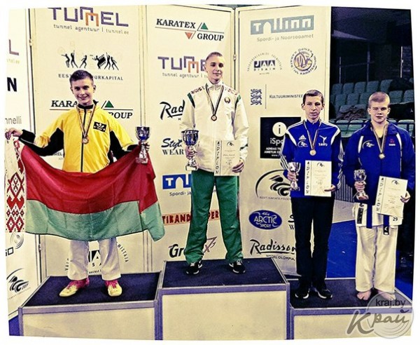 Никита Кириевич (в центре) занял первое место на международном турнире по каратэ в Эстонии. Фото предоставлено Край.бай Никитой Кириевичем