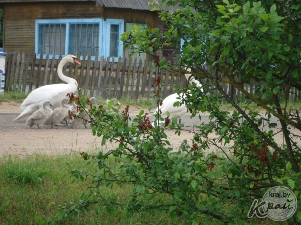 – Я была дома и вдруг услышала шум. Вышла на улицу и не могу понять, что случилось. А соседка и говорит: «Посмотри, какая красота, к нам лебединая семья пришла!». Смотрю, на лужайке папа-лебедь с красивой длинной шеей, пять маленьких еще не оперившихся птенцов пепельного цвета, а за ними и мама-лебедь. Я пошла в дом, чтобы позвать внучку. И вдруг прибежала соседка с криками, что надо спасать корову, – рассказала Край.бай Галина Стреж.