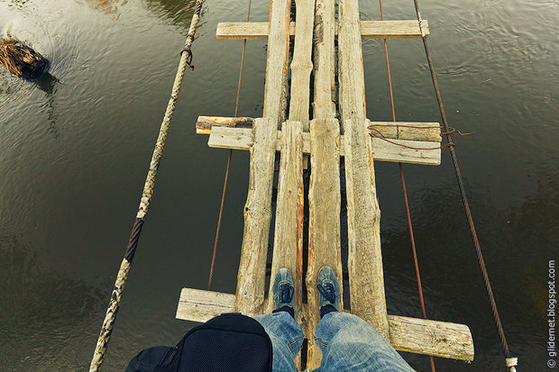 «Смело ринувшись сразу на середину, через несколько шагов я быстро остановился, ме-е-едленно повесил фотоаппарат на шею и осторожно-осторожно попятился назад. Мост, оказывается, порядком раскачивается, ходить по нему надо с некоторым навыком», – что ж, судя по фото, автор этих строчек – достаточно смелый человек.
