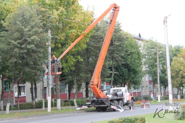 Улица 17 Сентября – одна из главных улиц города. Здесь работники ЖКХ активно меняли освещение. Рабочие рассказали Край.бай, что к празднику от центральной площади до площади Свободы будет установлено экономичное светодиодное освещение и, возможно, новая иллюминация. Такую же работу, добавили мужчины, планируется сделать на въезде в город на Стахановской, Волынца и со стороны Молодечно (д. Ставки). Новое освещение уже есть возле Маковья.