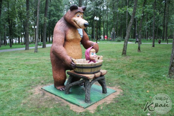 Сюжет из популярного российского мультсериала «Маша и Медведь» материализовался в центре города – двухметровый озорной Миша и неугомонная Маша готовятся к банной процедуре. Бетонные мультипликационные герои разместились рядом с «Репкой», композицией «Сава i дзяцел» и забавным Цыпленком.