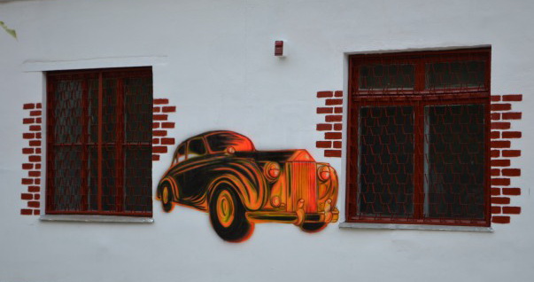 На стене СТО Вилейского государственного колледжа Денис Король краской изобразил автомобиль. Фото предоставлено Край.бай Светланой Мацукевич