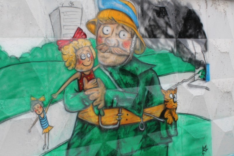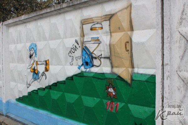 На бетонных стенах рынка уличный художник изобразил пожарного, а также напомнил о том, что не стоит забывать выключать электроприборы, и отдельно детям – о том, что спички могут привести к беде.