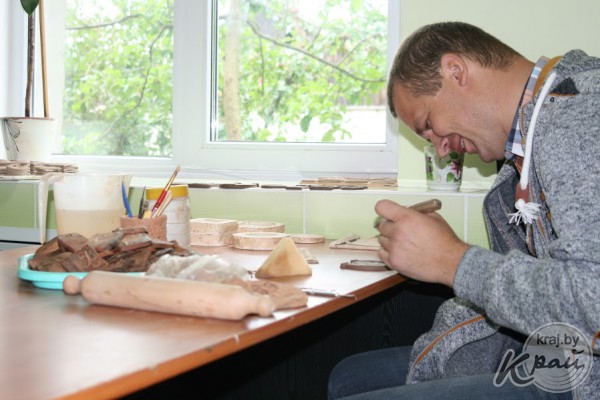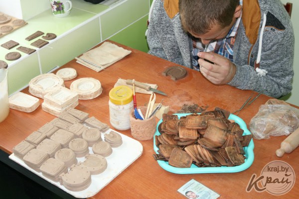 Ежедневно в 9 утра Юрий Клишевич уже у «станка». Место дислокации – «Дом ремесел». Там же кабинет на двоих с напарником, свой рабочий стол, килограммы глины и печь – здесь изготавливаются сувениры с символикой города. Потом их продают на фестах, ярмарках и «Дожинках». Юрий работает полдня – у него инвалидность 2-й группы. Максимальный рекорд в день – это 40 глиняных магнитиков. Хотя, нормы выработки нет. Зарабатывает он около 200 деноминированных рублей в месяц, плюс пособие по инвалидности. На жизнь не жалуется. Говорит, что хватает…