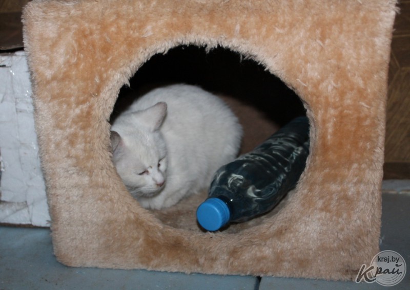 В небольшом помещении – несколько домиков из пенопласта. Ручная работа волонтеров. В самом большом – четверо постояльцев плотно прижались друг к другу. В соседнем от тепла пластиковой бутылки с водой задремал белый как снег найденыш, которого волонтеры принесли в приют в морозное воскресенье из центра города.