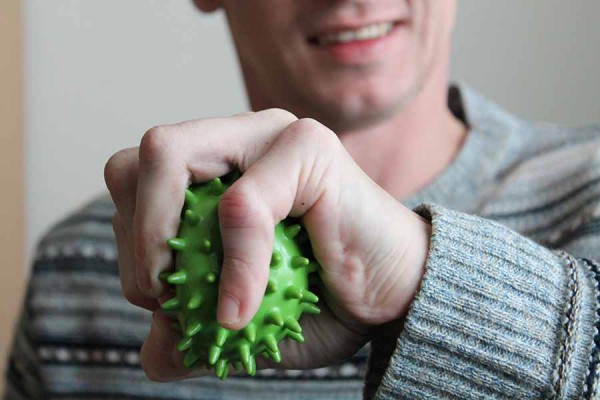 Парень непослушными пальцами левой руки сжимает массажный мячик.