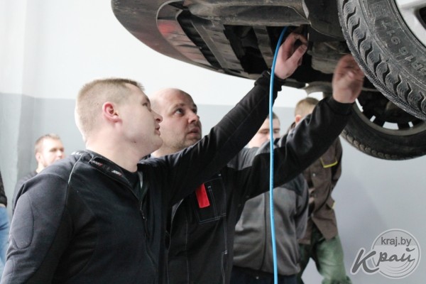 Работники СТО и будущие автослесари учились в Вилейке менять масло в автомобилях с коробкой автомат. Фото Юлии Лахвич, Край.бай