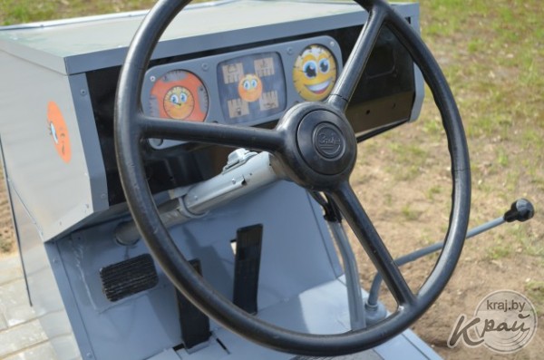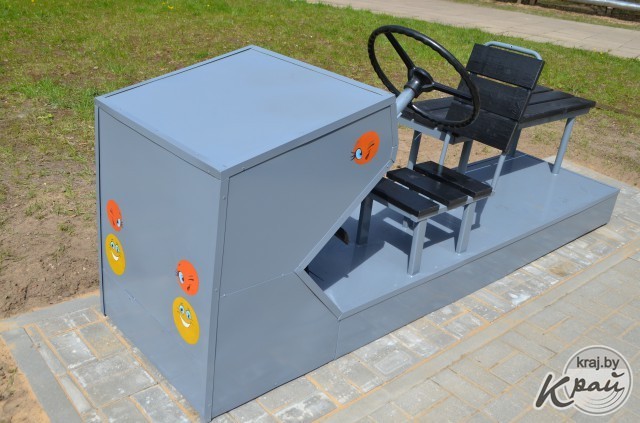 – Символизирует наша скамейка-автомобиль профессию водителя-слесаря-сварщика, которой обучают в колледже. Есть в ней коробка передач, сцепление, тормоза и руль – все, как в машине. Сидение водителя и скамейка для пассажиров выполнены из дерева, как у «шараповского» автобуса послевоенных лет. Так как скамейка будет стоять под открытым небом, мы посчитали дерево наиболее практичным материалом, – отметил заместитель директора по производственному обучению Вилейского государственного колледжа.