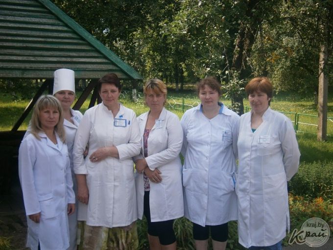Слева направо: фельдшер Татьяна Боговец, старшая медсестра Валентина Шиковец, фельдшер Таиса Нарейко, медсестра физиотерапевтического кабинета Жанна Буславская, санитарка Татьяна Харлинская, санитарка Елена Гомолко