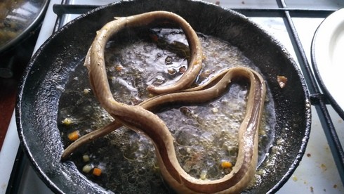 – Главное – знать технику отлова змеи. О приемах рассказывать не буду во избежание проблем. Дальше проще – убираем голову, где находится ядовитая железа, потрошим, снимаем кожу и готовим. Я люблю жарить со специями. Еще змей сушу. У сушеного ужа вкус похуже, а вот у гадюки – вполне.