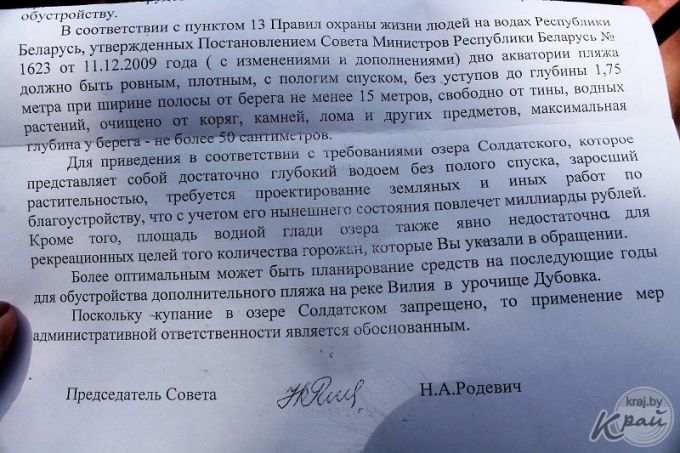 Исключить озеро из списка запрещенных вилейчане просили у властей официально не единожды. Им отвечали, что дно акватории илистое, водоем зарастает кувшинками, есть металлические предметы и неопознанная яма. А чтобы привести озеро в соответствие с требованиями, «необходимо проектировать земляные работы, что повлечет миллиарды рублей». Таким был, например, официальный ответ Виталию Голубицкому от бывшего председателя Вилейского районного Совета депутатов Наталии Родевич.