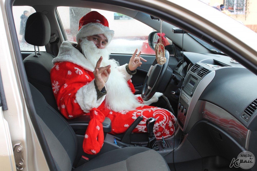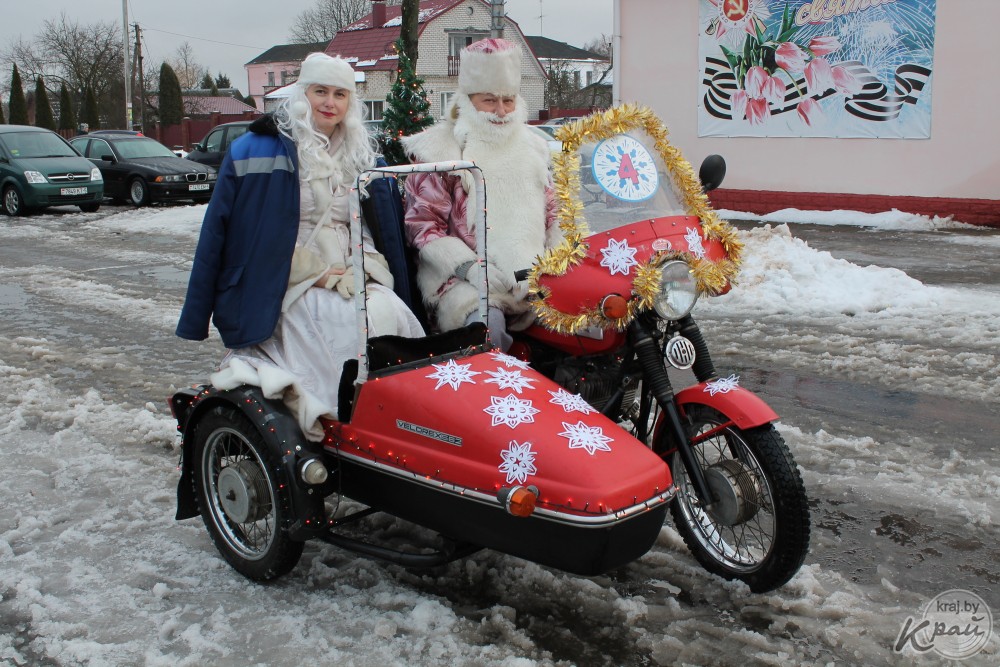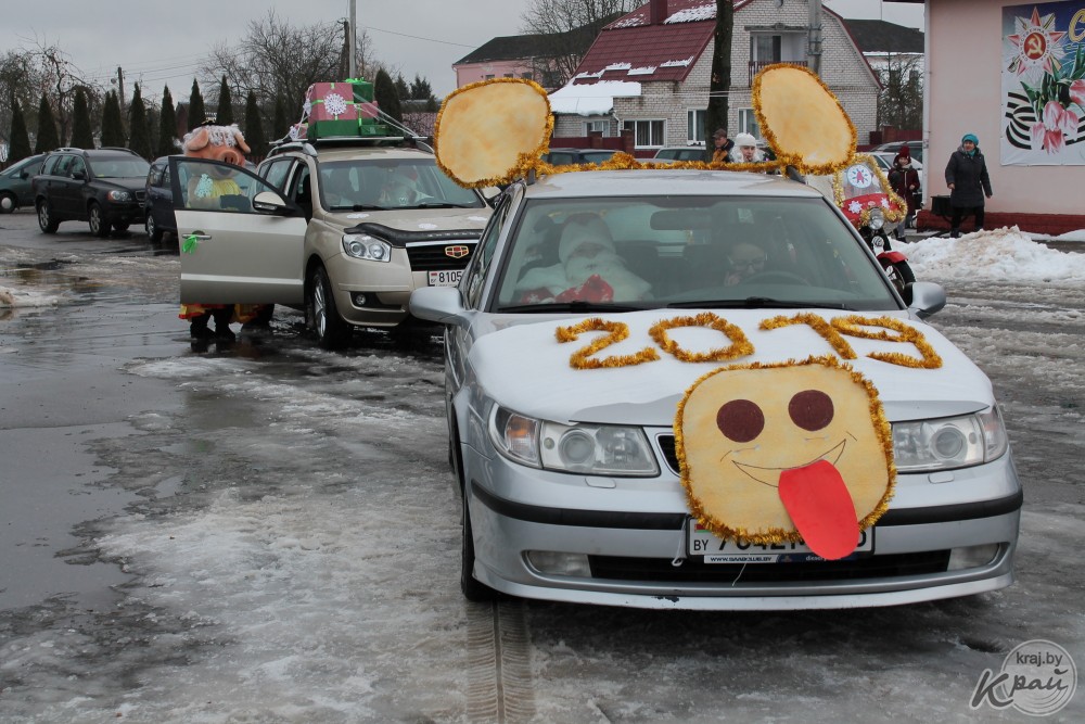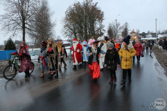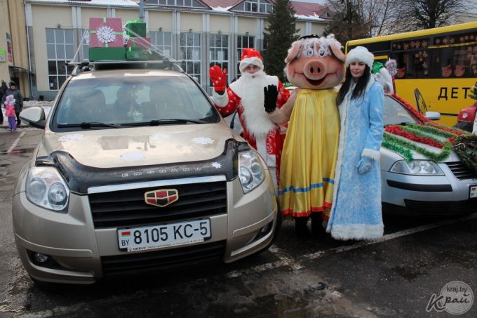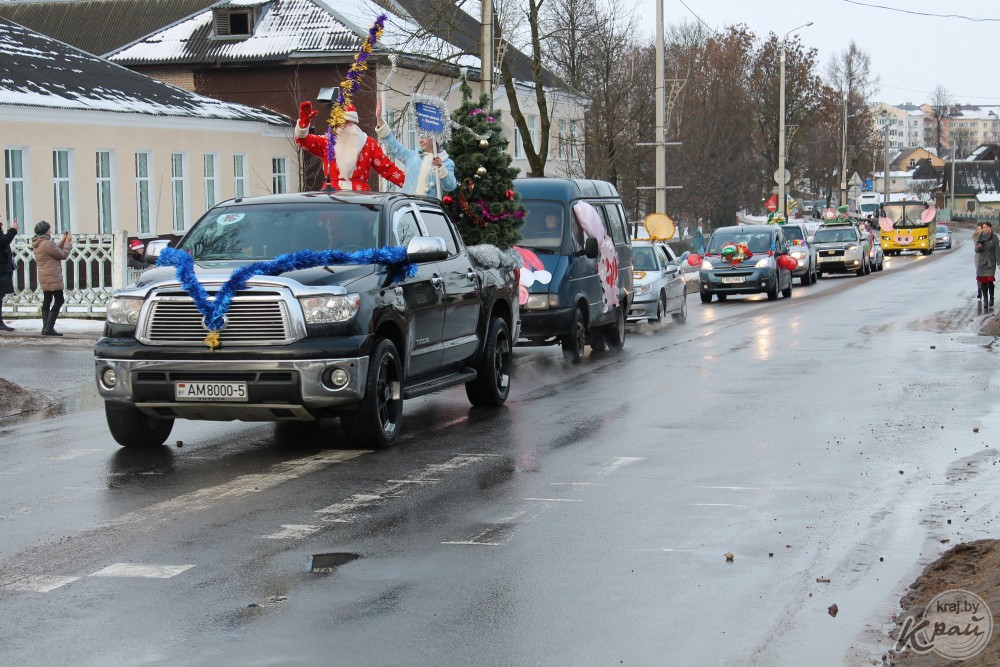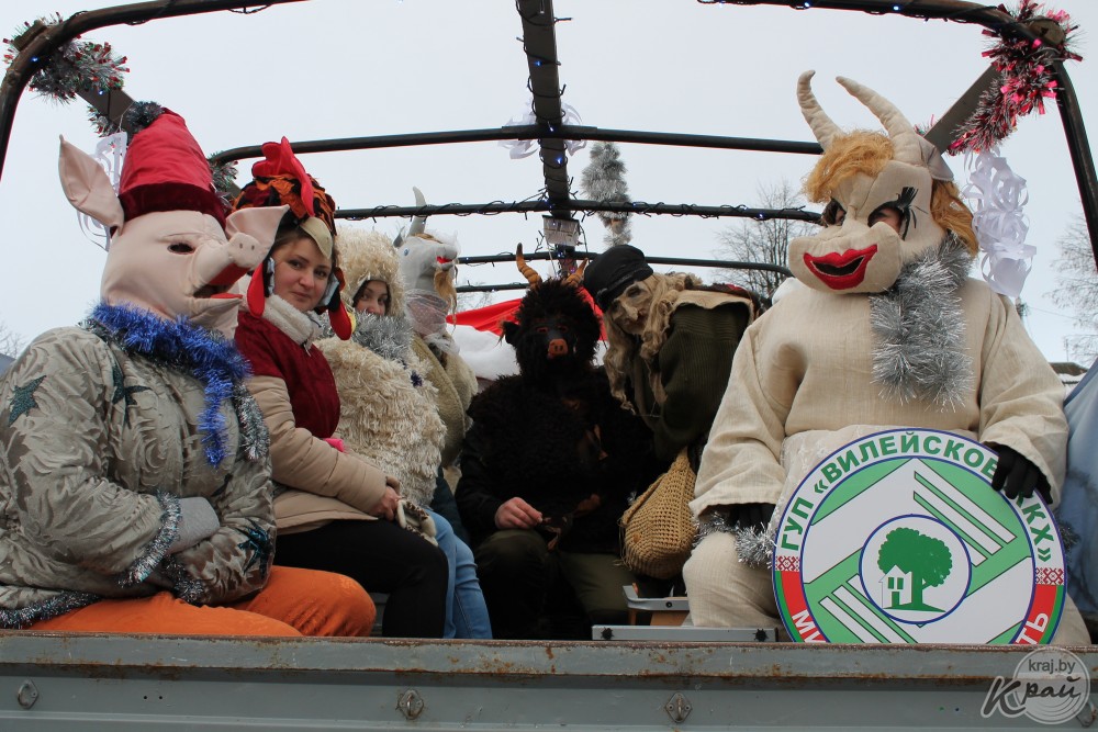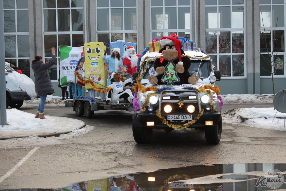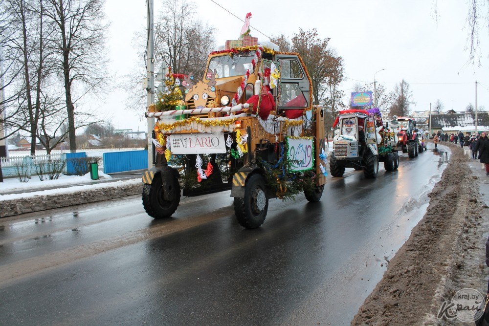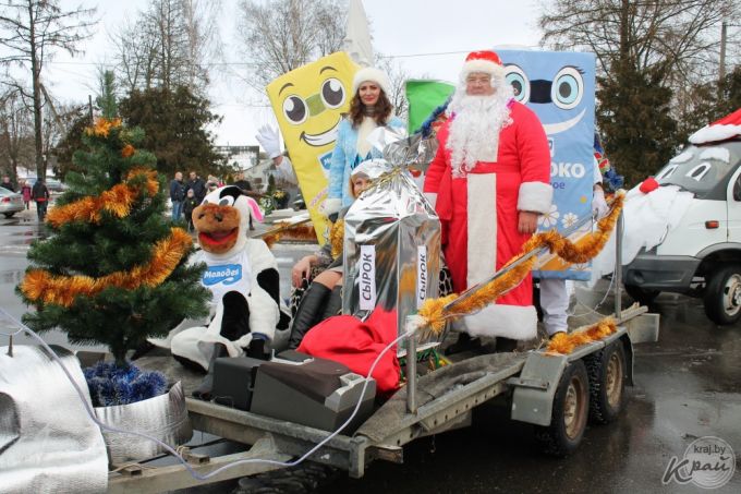 Вилейский госколледж пригнал на автопарад новенький трактор, вилейский производственный участок Молодечненского молочного комбината загрузил в кузов «ходячий» пакет молока, упаковку сыра «Моцарелла» и деда Мороза со Снегурочкой, а Вилейское ЖХК – свиту из сказочных персонажей. Кстати, костюмы сшила мастер предприятия Людмила Пацкова, примерившая на себя образ Бабы Яги.