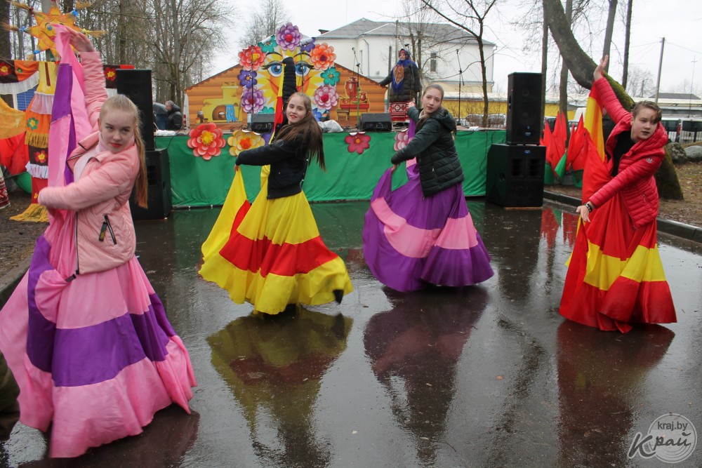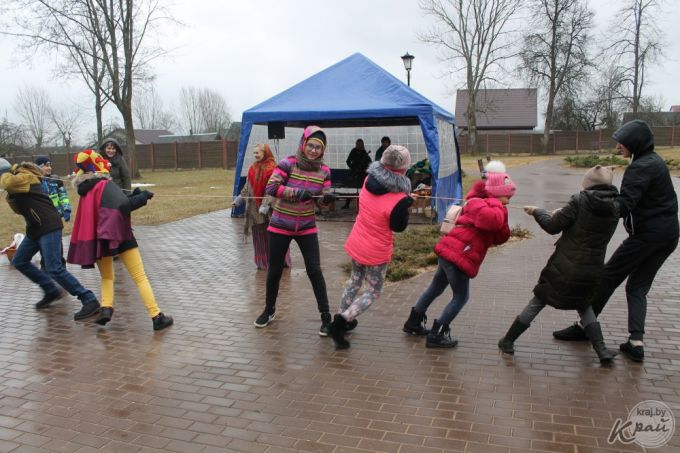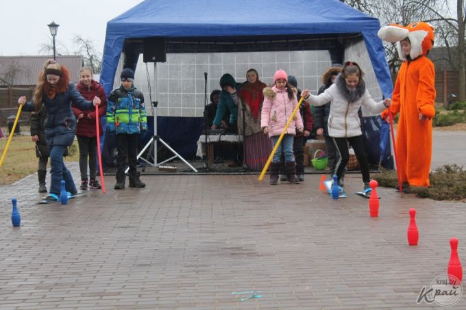 Дождливым воскресным днем вилейчан развлекали артисты, главным персонажем традиционных гуляний стала Масленица. А для маленьких вилейчан одновременно в нескольких метах работали игровые зоны. Центр эстетического воспитания устроил зимние состязания по метанию бумажных снежков, перетягиванию каната с ростовыми куклами в командах и забеги на самодельных лыжах по асфальту, а физкультурники организовали гонки на самокатах.