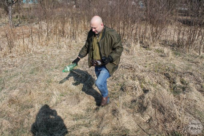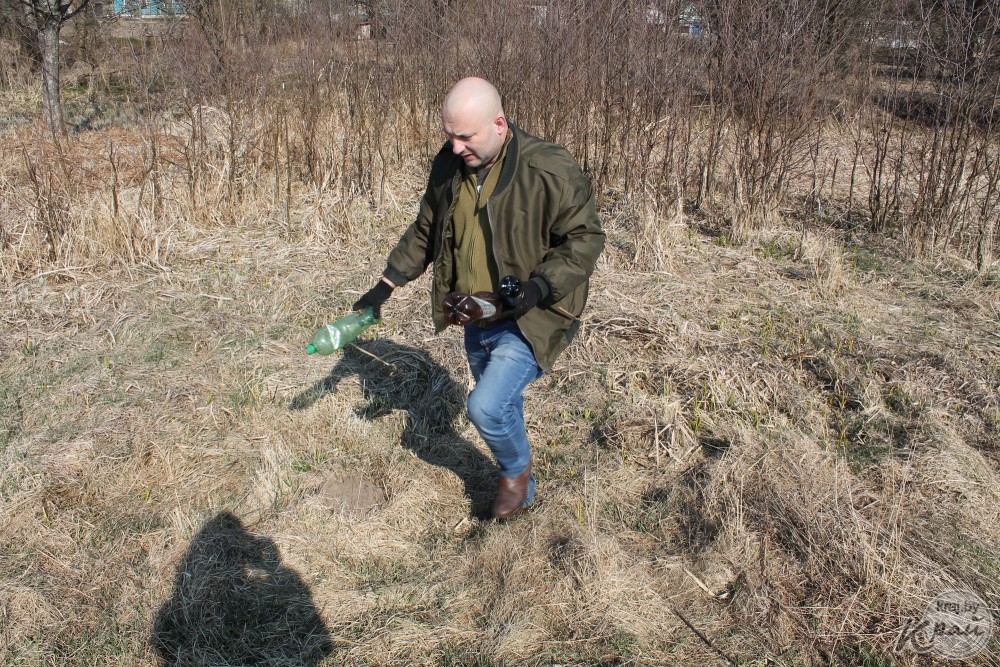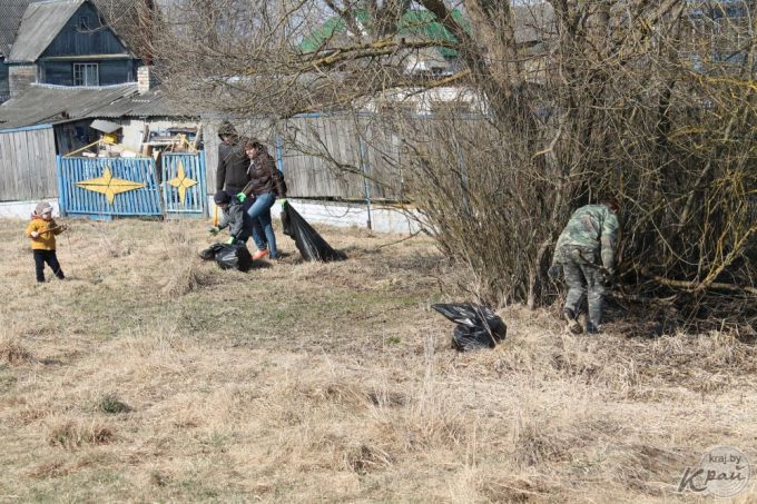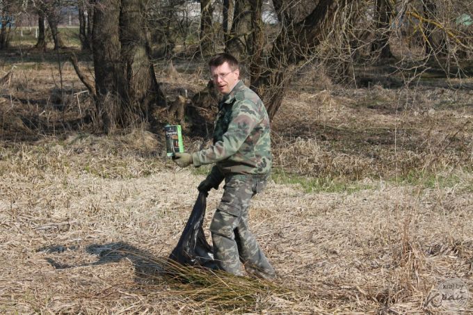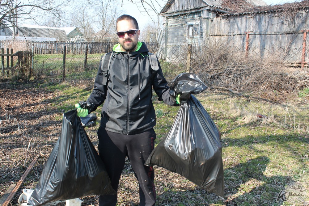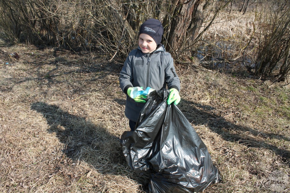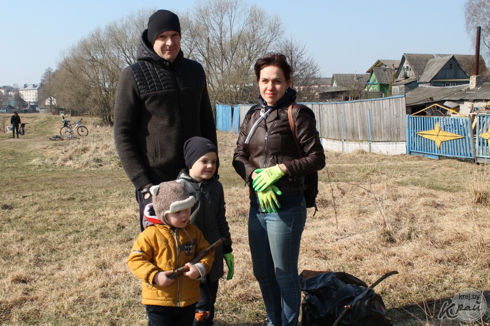 На улице +10. Ярко светит солнце. У активистов трудовое настроение. Их немного. 10 человек. Самому младшему Косте Микуличу почти 3 года. Костик старательно несет мусор в пакет. Папа Максим хвалит сына за старания, а Костик учится у взрослых с детства беречь природу.