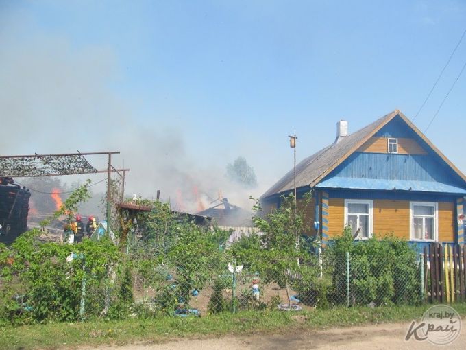 На одном участке горели жилой дом и сарай. Через дорогу – еще один дом и расположенные с ним под одной крышей гараж и постройка. Также пламя перекинулось на стоящие в семи метрах от дома еще три сарая.