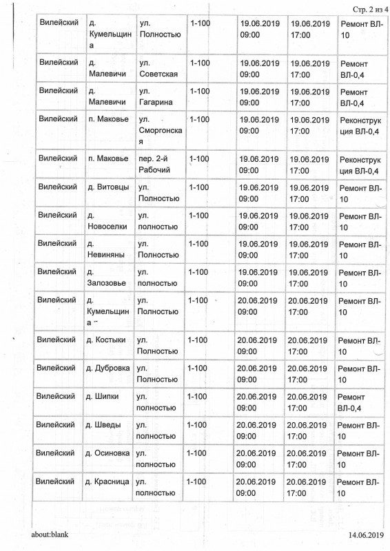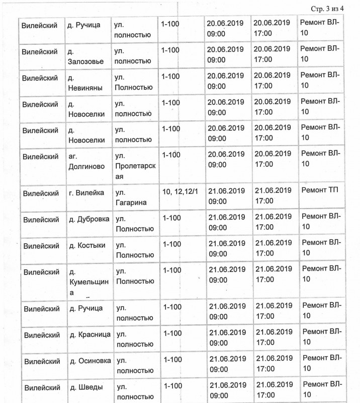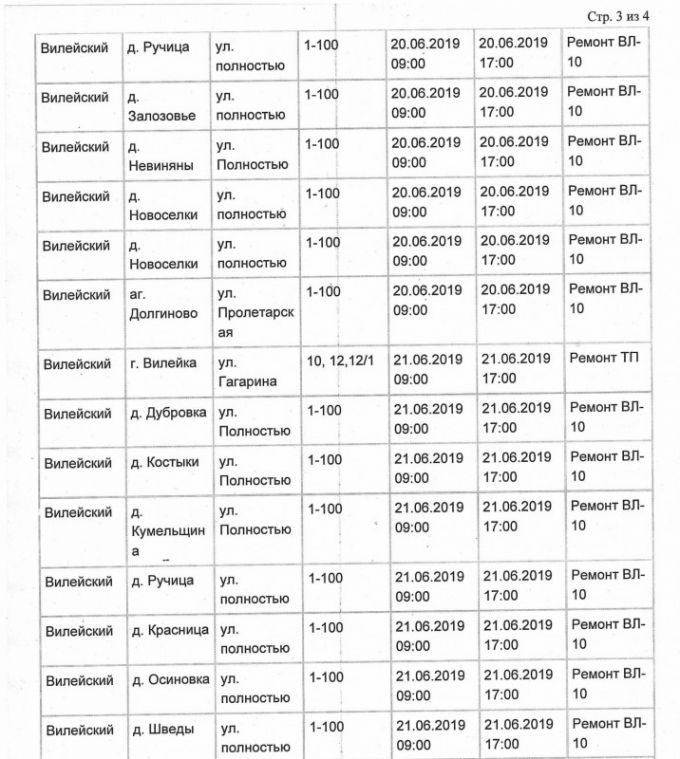 График отключения электроэнергии в Вилейке и районе 17-21 июня