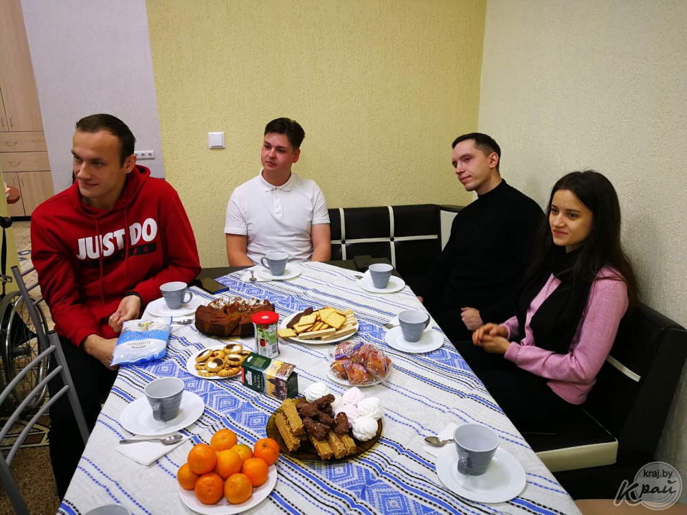Стихи, песни, чаепитие и театрализация с участием самих волонтеров – такой получилась очередная встреча 21 декабря. Волонтеры Артур Ставский, Алеся Челик, Николай Тушинский, Татьяна Мойсевич, Алексей Городничий и Валерий Романёнок посетили воспитанников «Ласточки» во второй раз. Пришли не с пустыми руками. Активисты собрали почти 300 рублей и передали заведующей отделением Светлане Павловой. Помощь оказалась нужной. По словам Светланы Павловой, в отделение купят новый стол-трансформер. В прошлый раз деньги волонтеров потратили на покупку поручней для комфортного передвижения воспитанников с тяжелым физическим недугом.