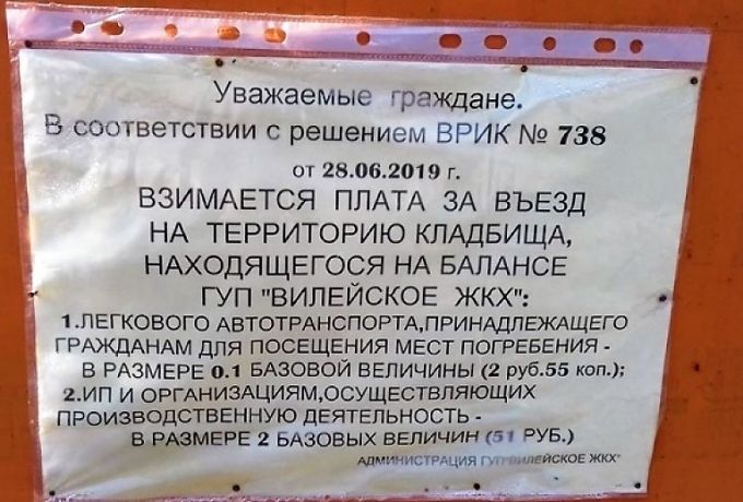 Хотите узнать больше? Въезд на кладбище в Вилейке стал платным. Чтобы въехать на территорию, частным лицам нужно заплатить 2 рубля 55 копеек. Въезд для предпринимателей –