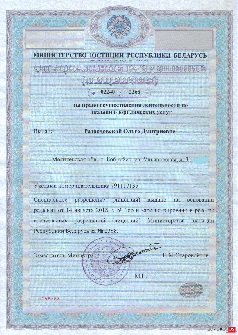 лицензия Минюста Республики Беларуси №02240/2368 от 14.08.2018