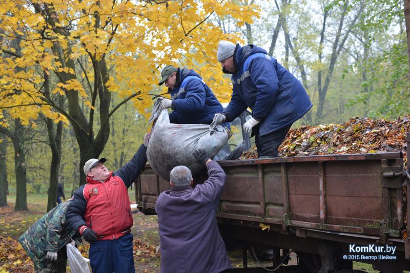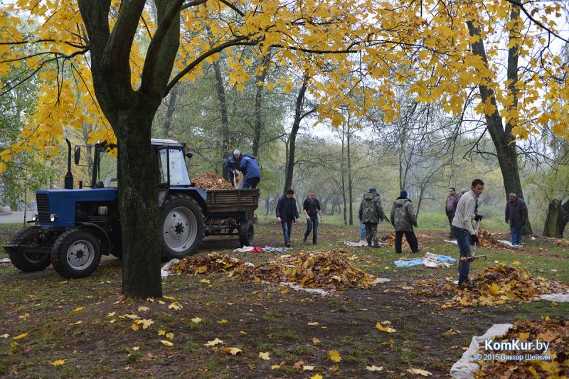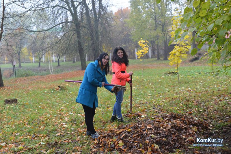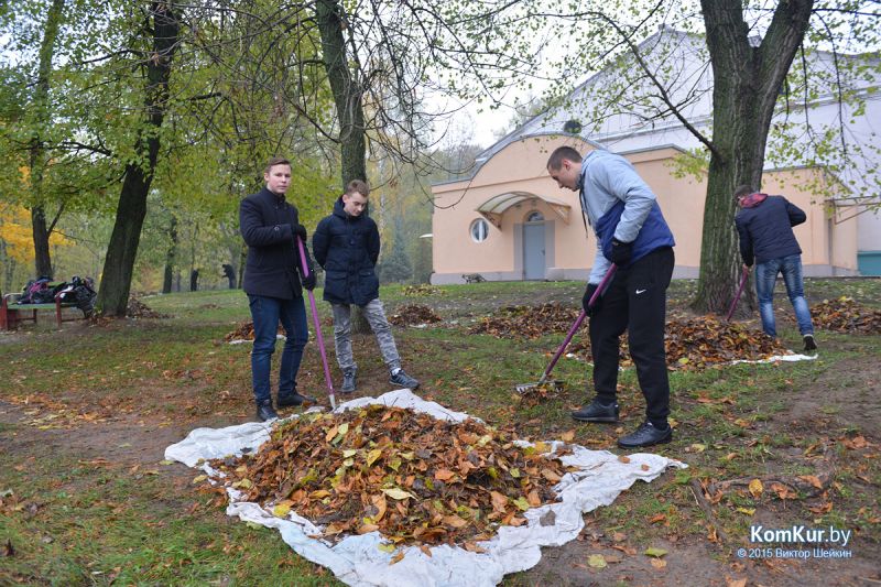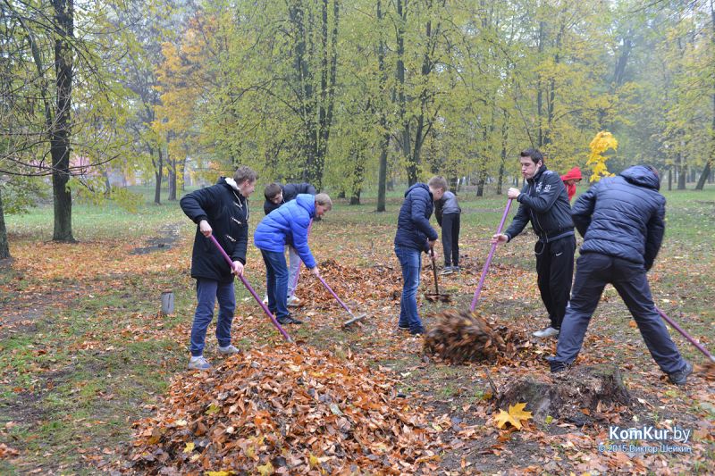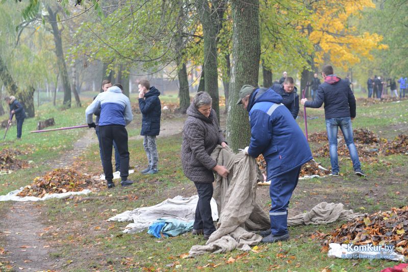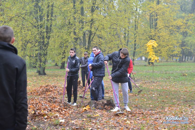 Подобная акция работников парка совместно с активистами БРСМ уже проводилась в сентябре. На этот раз инициативу проявила союзная молодежь из первичной организации филиала БНТУ Бобруйского государственного автотранспортного колледжа. В начале десятого утра в парке, за кинотеатром «Мир», мы с фотокорреспондентом встретили около тридцати молодых людей с вилами, работников парка, а также Бобруйской городской и районной инспекции природных ресурсов и охраны окружающей среды. Присутствовавший на месте директор парка А. П. Виноградов представил журналистам план работ: