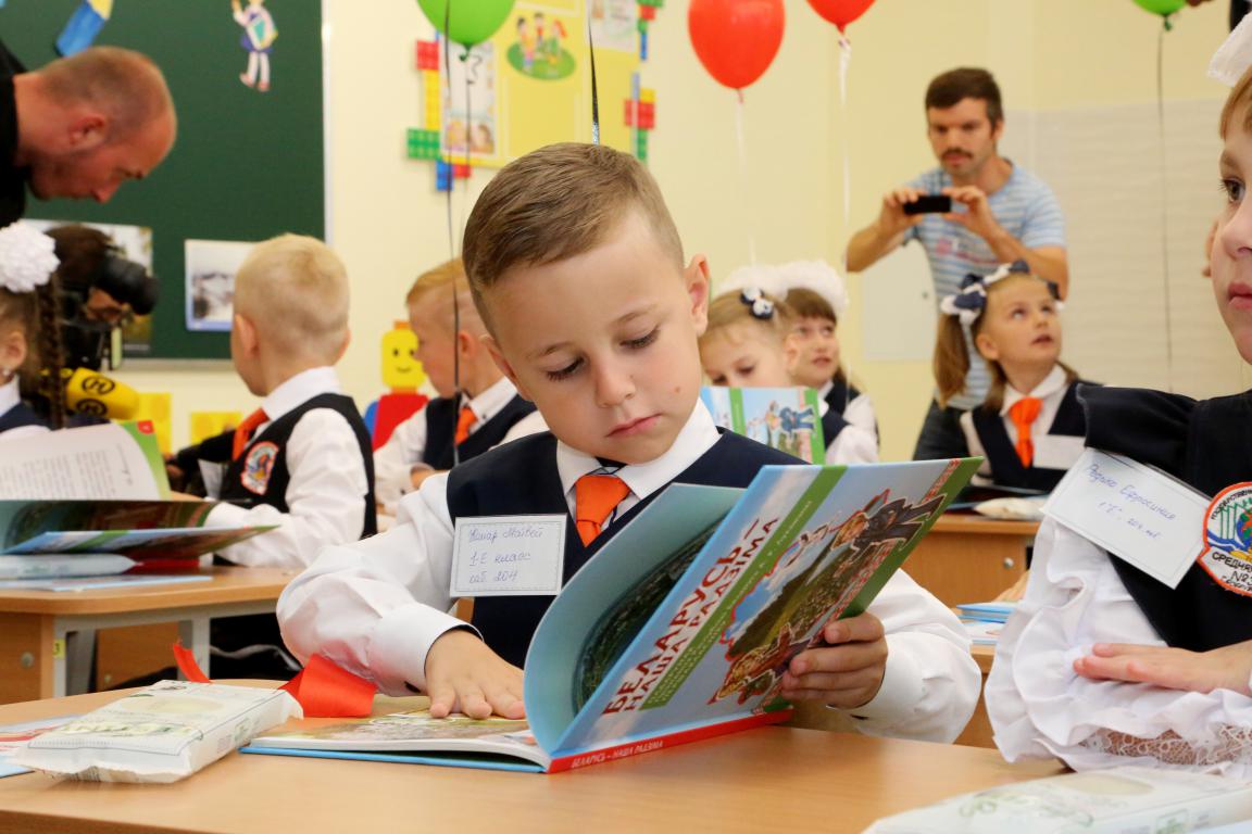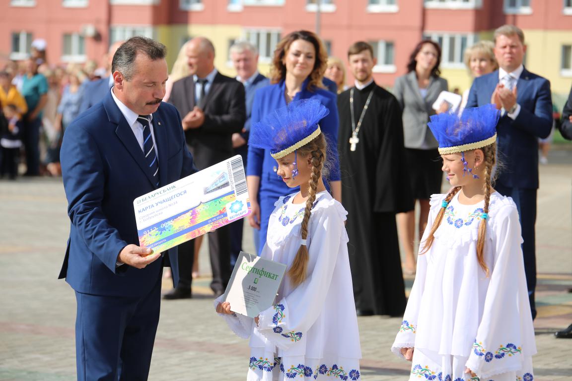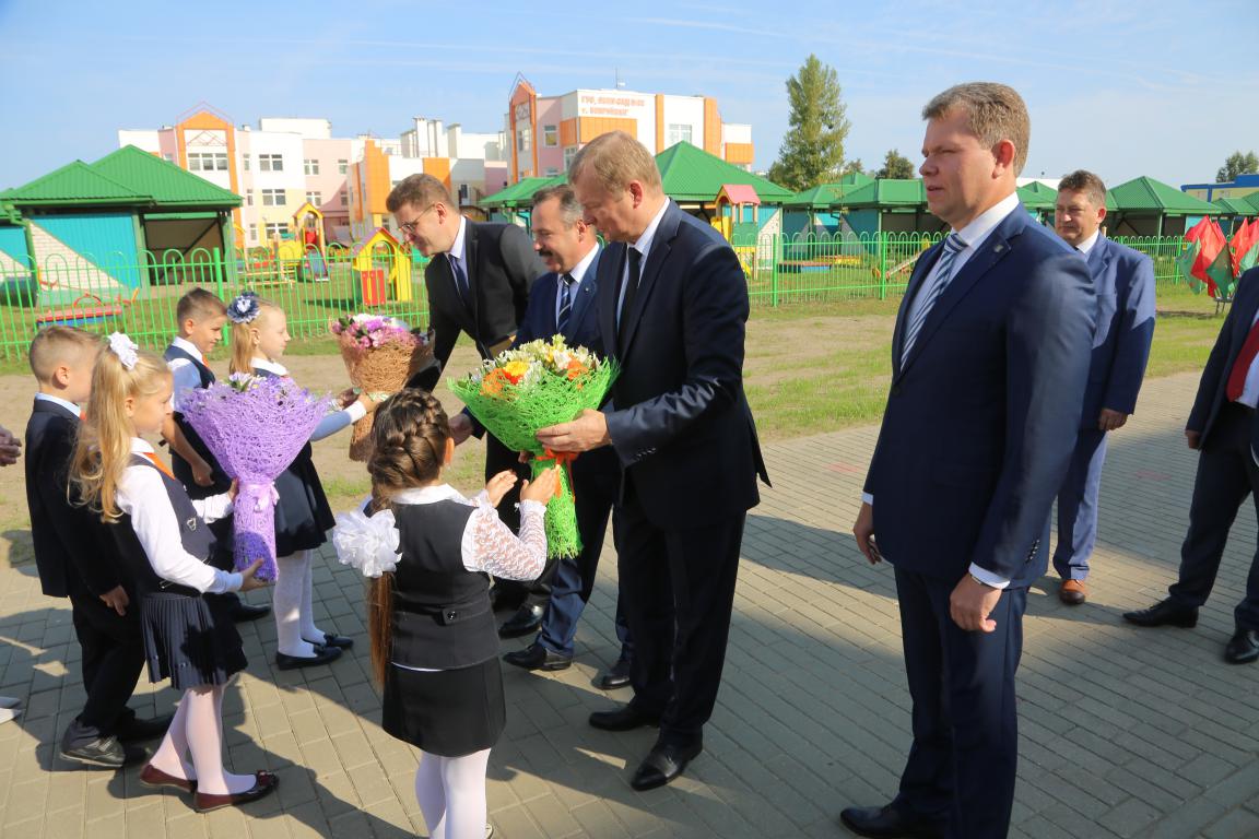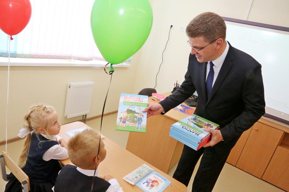 Первыми в стены школы вошли первоклассники и сели за новенькие парты в светлых просторных классах. Почетные гости вручили им подарок от Президента Республики Беларусь — книгу «Беларусь — наша Радзіма», которая расскажет им о нашей стране, ее достижениях, устремленности в будущее.