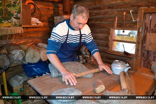 За чаем с медом и блинами (кстати, Валентин еще и пчеловод) узнаю, что изготовление валенок процветало в этих местах в XVIII-XIX веках. Существует две версии появления шаповальства на Дрибинщине. По первой - местный владелец фольварка стал приглашать селиться сюда крестьян, и кто-то из них принес с собой это искусство, которое здесь получило распространение. Вторая версия гласит, что местный помещик Антон Цехановецкий отправил несколько молодых крестьян в Россию для обучения. Мужики быстро научились и стали валять дома и шапки, и валенки, и рукавицы, и одеяла, и хомуты, и потники для конской сбруи. Позже ремесло переросло в отходный промысел - с наступлением морозов мужики шли по тем деревням, где держали овец, и предлагали свои услуги. Женщины, как правило, занимались заготовкой шерсти и продавали валенки на ярмарках. Чтобы сохранить секреты мастерства, придумали и свой язык - катрушницкий лемезень.