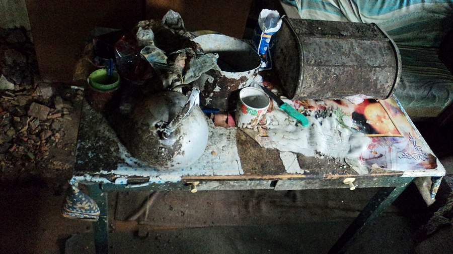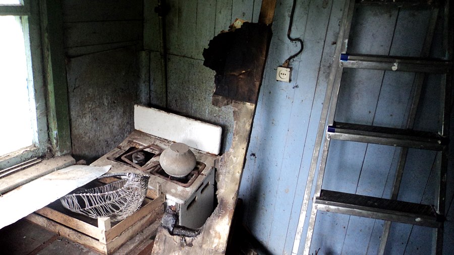Из обстановки мы обнаружили только вешалку, на которой висит нехитрый скарб хозяина, колченогий стул, шаткий стол, да полуразвалившуюся печь, которая (как мы потом узнали) сильно пострадала от недавнего пожара. Из съестных припасов в доме имелся только пакет кефира с истекшим сроком годности.